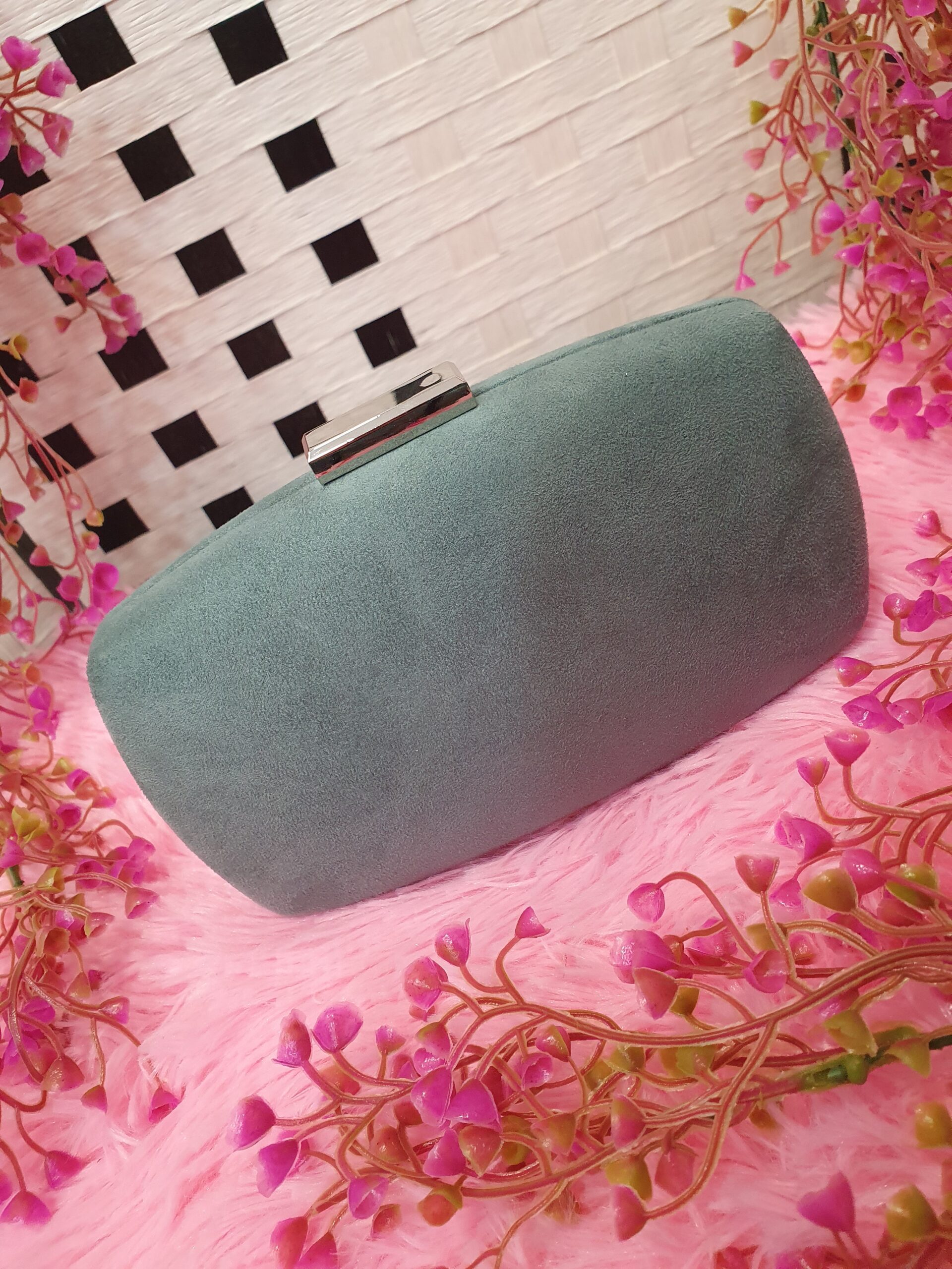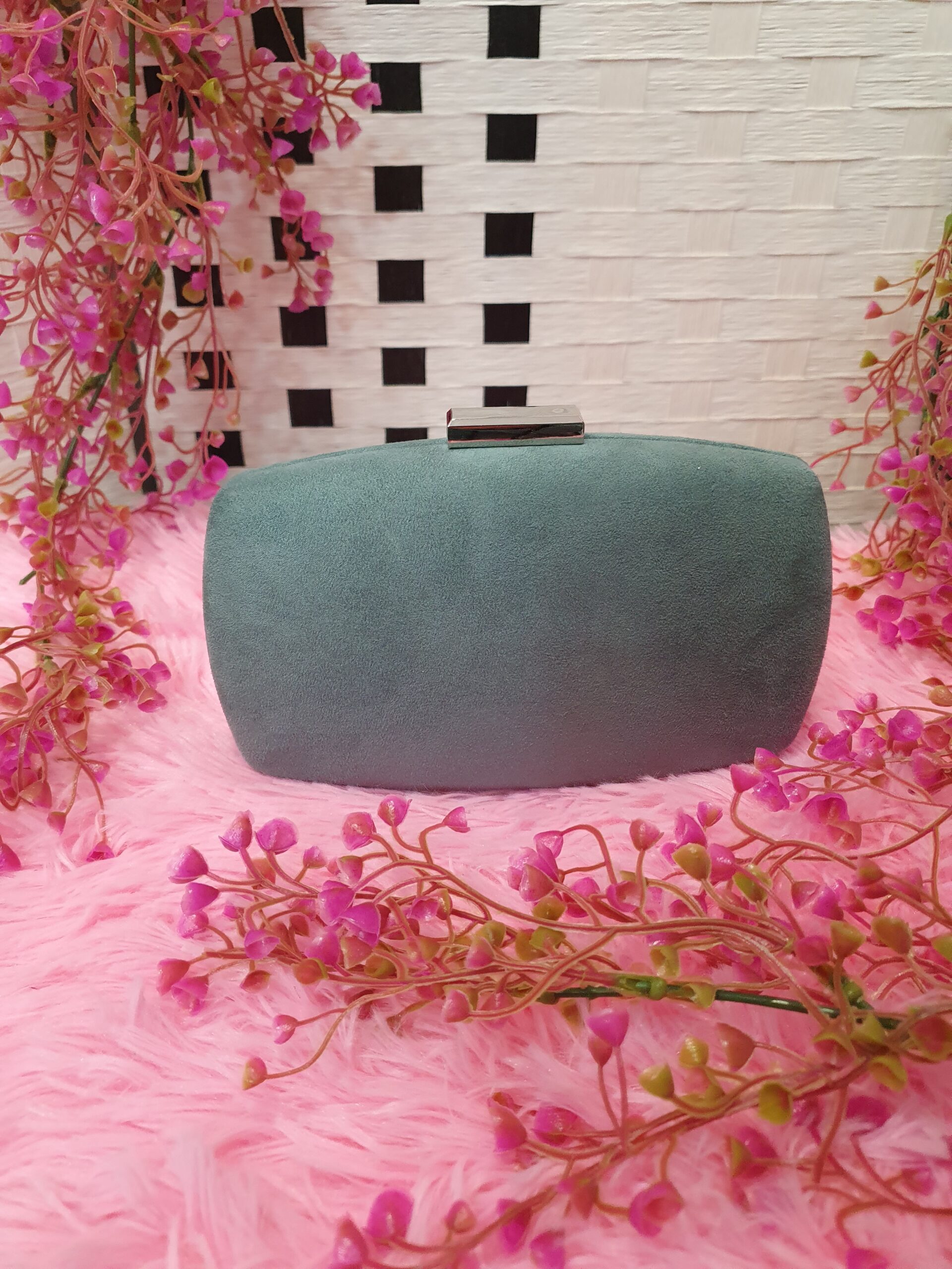 Bolso de fiesta confeccionado en tejido de antelina con terminaciones en plata. Lleva asa adicional para colgar de bandolera.