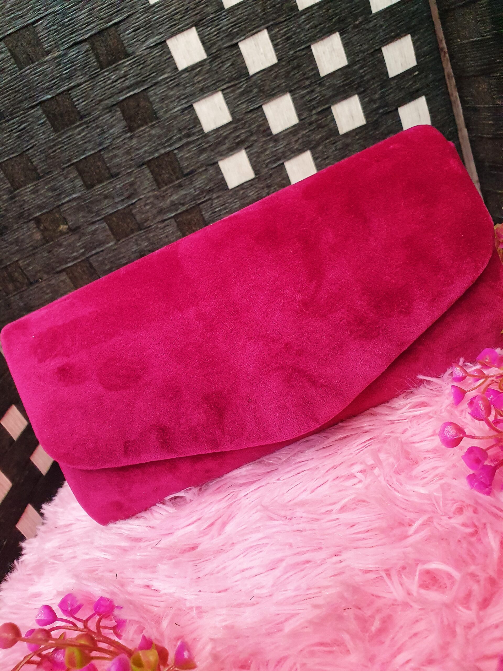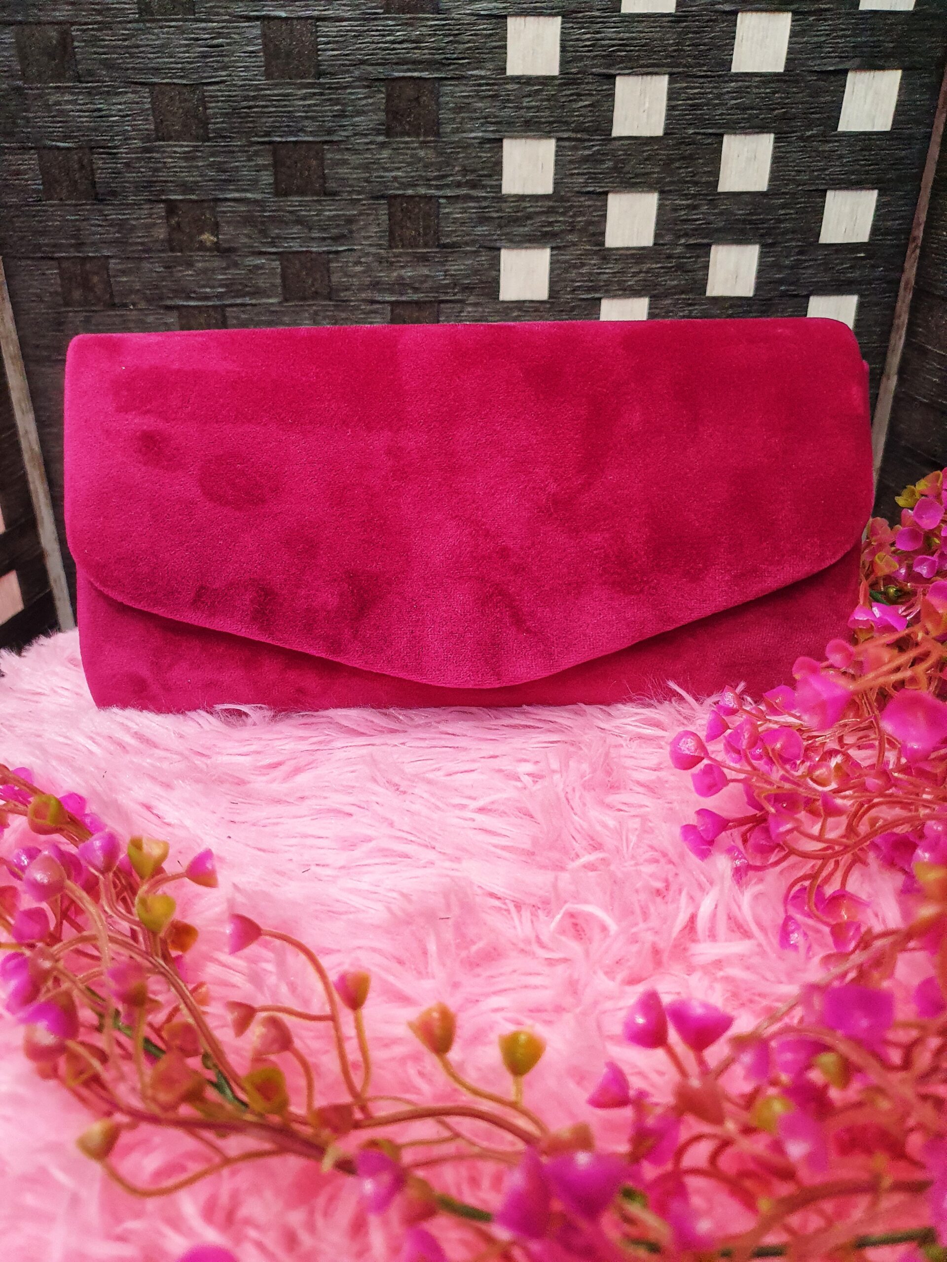 Bolso de fiesta confeccionado en tejido de terciopelo. Lleva asa adicional para colgar de bandolera.