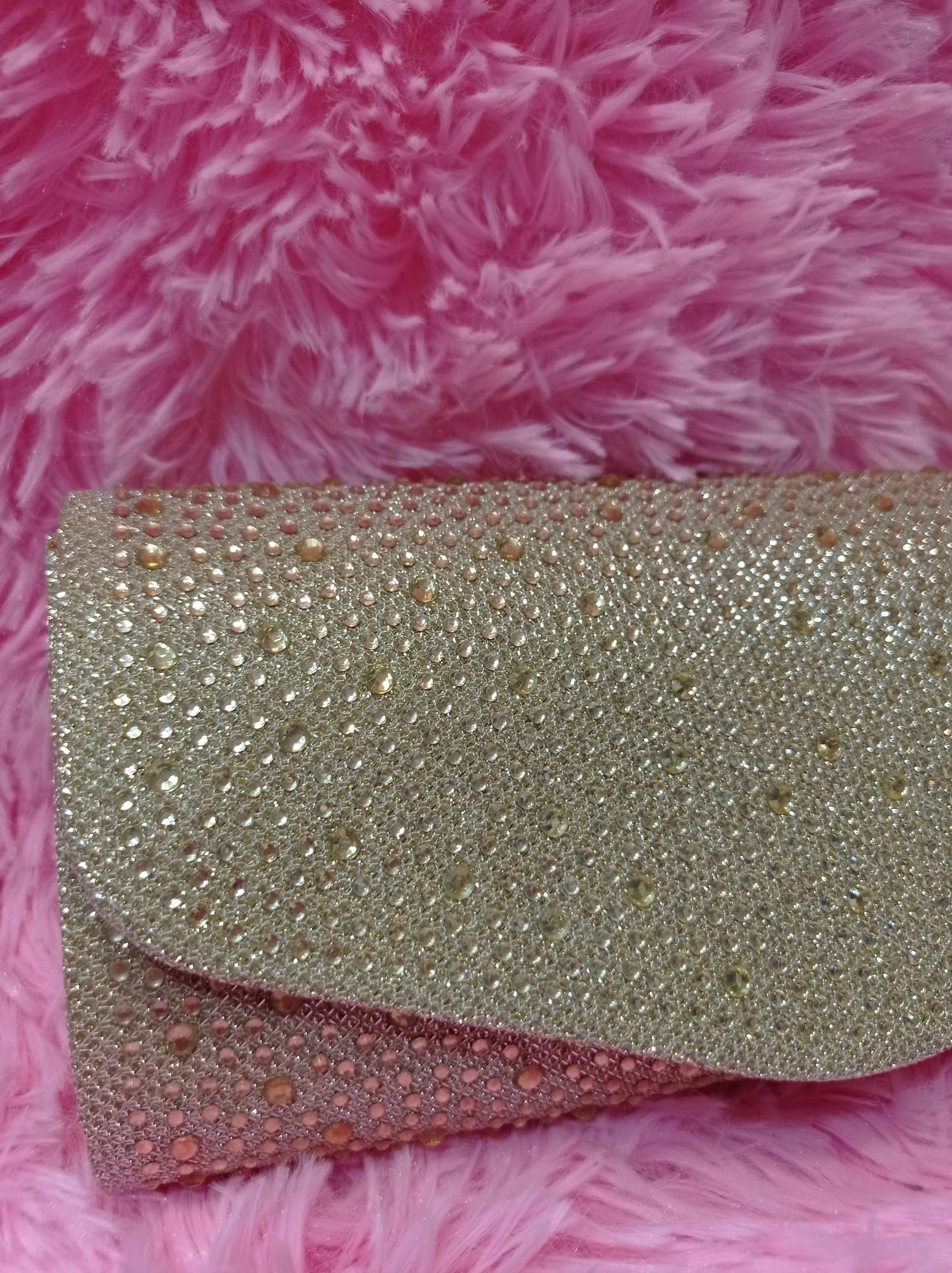 Bolso confeccionado abalorios dorados haciendo efecto mojado. Lleva cadena adicional para poder colgar.