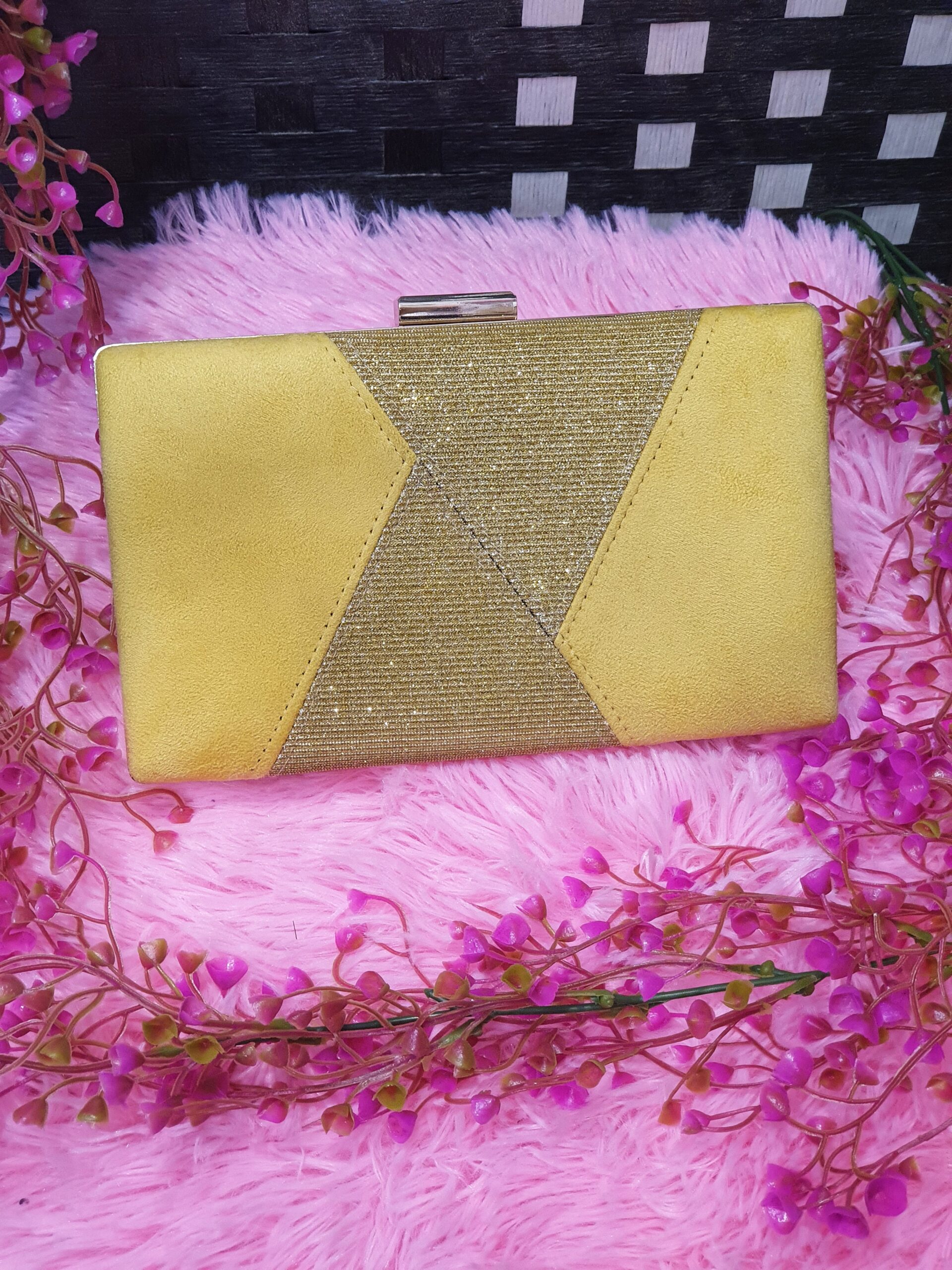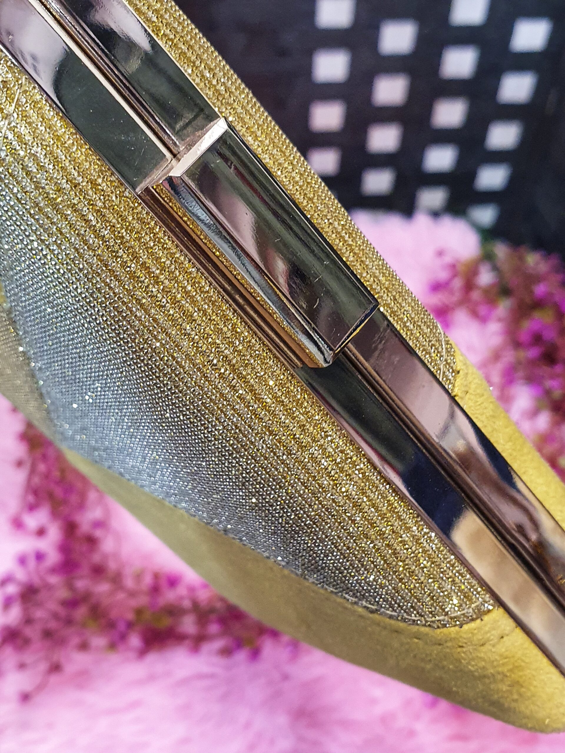 Bolso de fiesta confeccionado en tejido de antelina con terminaciones en dorado. Lleva asa adicional para colgar de bandolera.