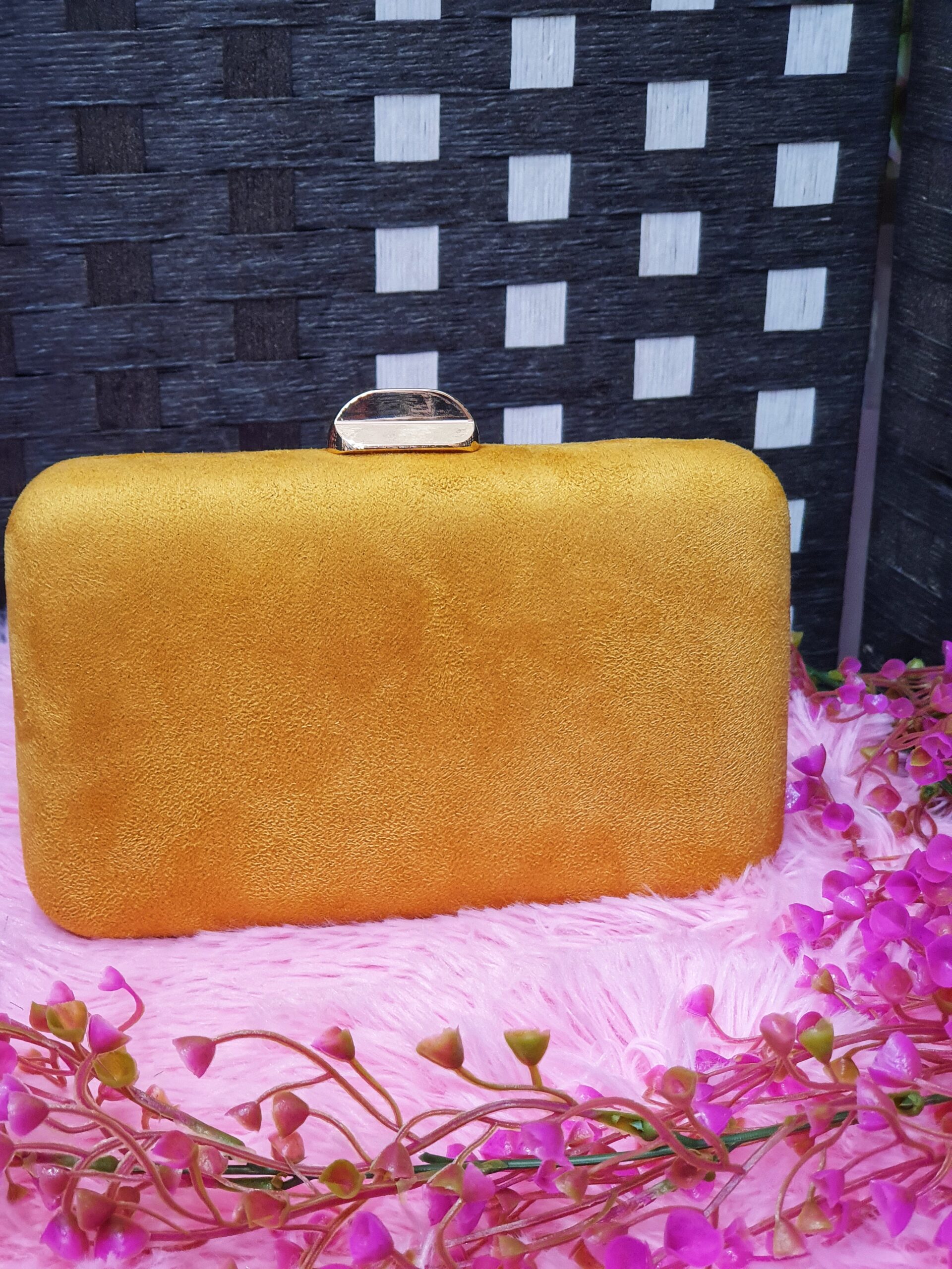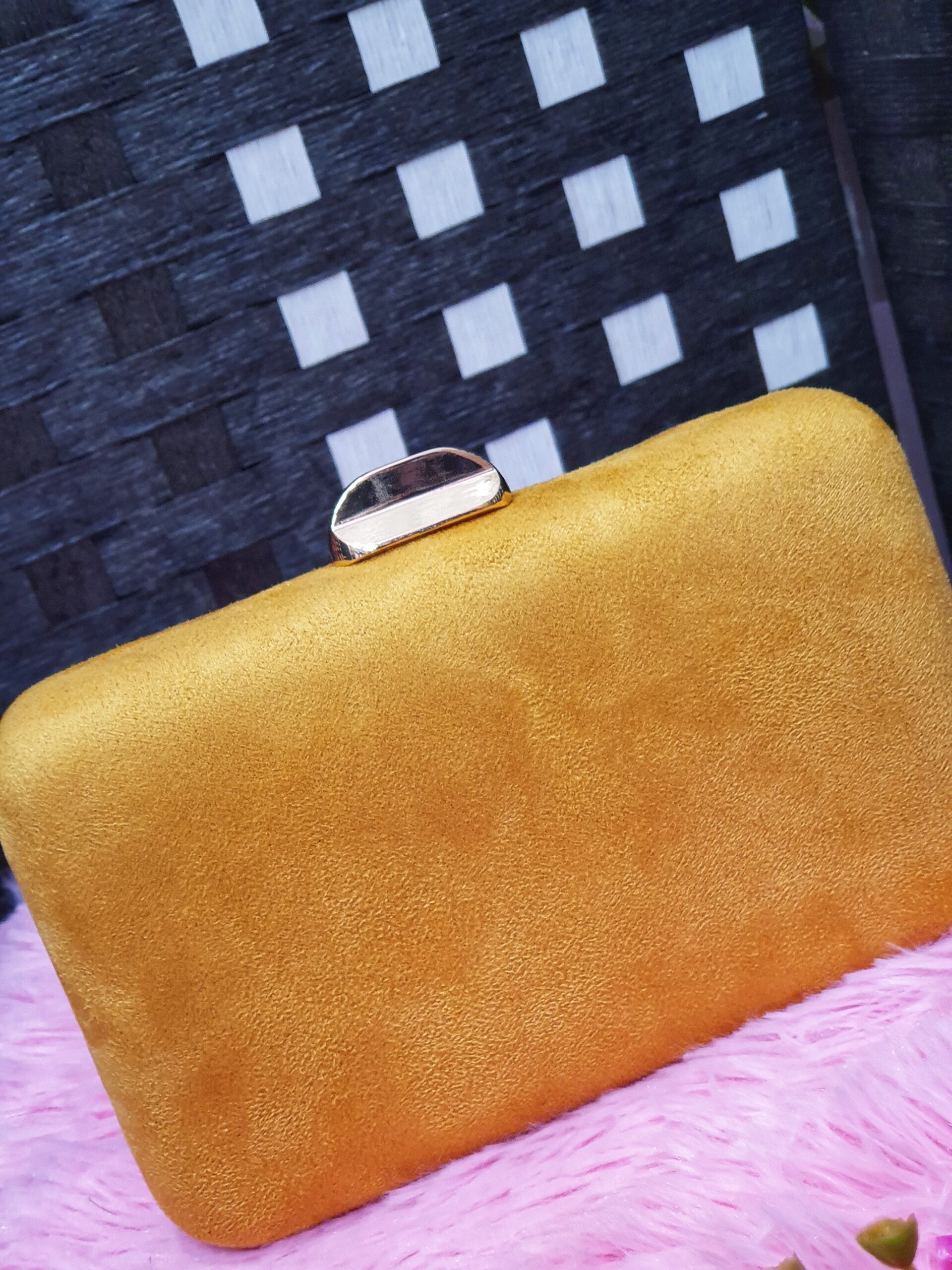 Bolso de fiesta confeccionado en tejido de antelina con terminaciones en dorado.